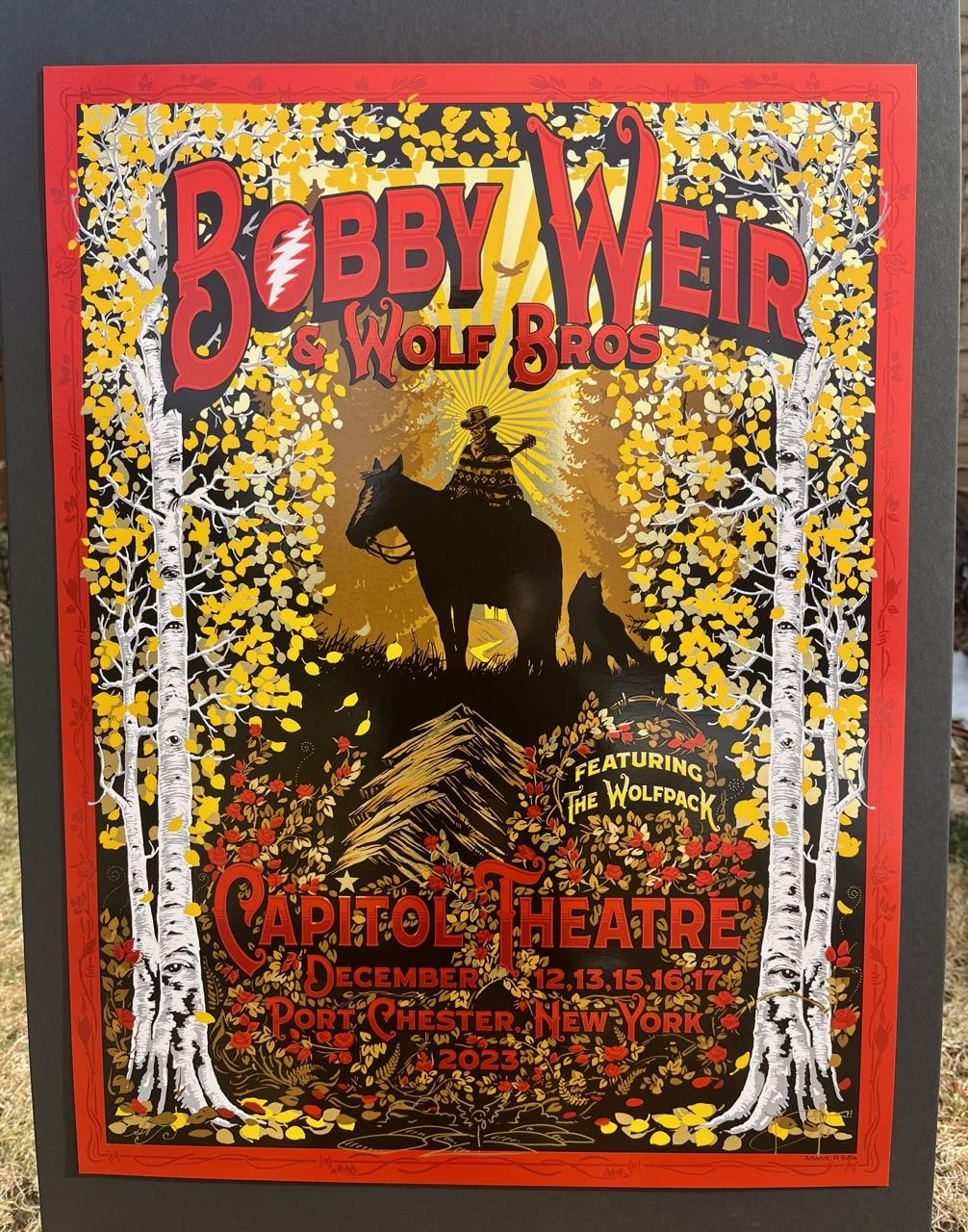 THIS IS AN ORIGINAL SILK SCREENED POSTER. OUTSTANDING RICHARD BIFFLE POSTER FOR BOBBY WEIR AND WOLF BROS / WOLFPACK AT THE CAPITOL THEATRE. SHOW WERE DECEMBER 12-13-15-16-17. 2023. THIS IS A 7 COLOR SILK SCREEN ON GOLD FOIL PAPER. THIS IS EMBELLISHED, SIGNED,A/Ped, BY ARTIST RICHARD BIFFLE. POSTERS SOLD AT SHOW WERE NOT SIGNED. IT IS MINT AND MEASURES AN EASY TO FRAME 18" X 24". PRIORITY MAIL USA / FIRST CLASS INTERNATIONAL.CHECK OUT ROCKCANDYPOSTERS.COM AND JOIN EMAIL LIST.