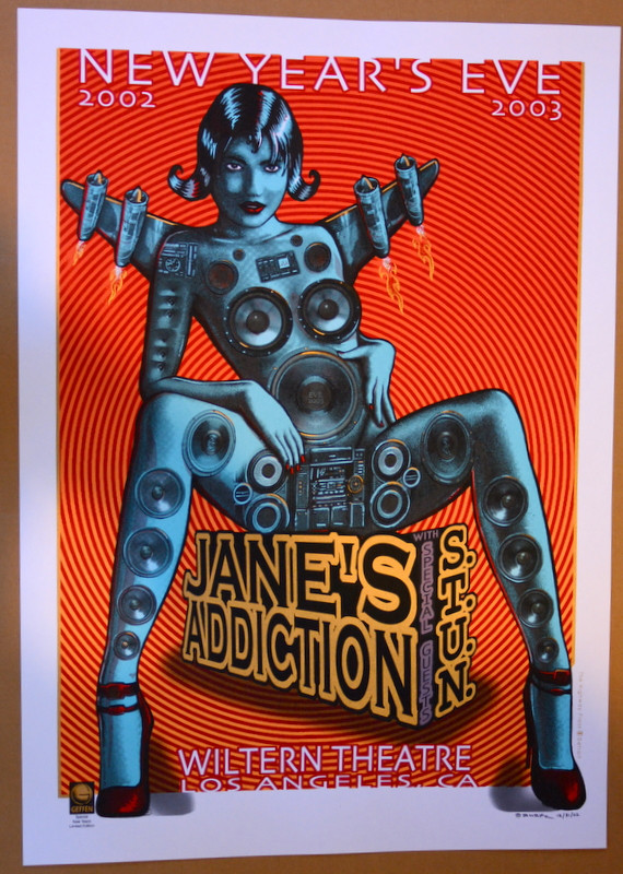 THIS IS A MUST HAVE FOR JANE'S ADDUCTION FANS. DONE IN 2002, ICONIC IMAGE. THE POSTER IS NOT NUMBERED OR HAND SIGNED. THIS IS A BEAUTIFUL HIGH QUALITY SILK SCREENED PRINT. DONE BY EMEK. IT IS PRINTED SIGNATURE OF EMEK, SEE PHOTO. IT IS FOR THE NEW YEARS EVE SHOW 12-31,2002 SHOW AT THE WORLD FAMOUS WILTERN THEATRE IN LOS ANGELES. IT IS IN MINT CONDITION, THEY HAVE NEVER BEEN HUNG. IT MEASURES 21.00"X 29.00". . THIS IS NOT ONE YOU WILL FIND AROUND. USA PRIORITY MAIL. FIRST CLASS INTERNATIONAL.