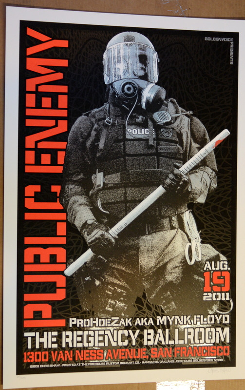 A PERFECT IMAGE FOR PUBLIC ENEMY. THIS POSTER IS A LIMITED EDITION SILK SCREENED POSTER. DONE BY SAN FRANCISCO ARTIST CHRIS SHAW. THESE POSTERS ARE SIGNED AND NUMBERED, EDITION OF 145. IT IS IN MINT CONDITION. IT MEASURES AN IMPRESSIVE 20.00" X 30.00". THIS IS FOR THE AUGUST 19,2011SHOW AT THE REGENCY BALLROOM IN SAN FRANCISCO. BEAUTIFUL PRINTING JOB, SILVER INK HIGHLIGHTS. . PRINTED AT FIREHOUSE / GOLDEN VOICE SERIES #139. USA PRIORITY MAIL. FIRST CLASS INTERNATIONAL.