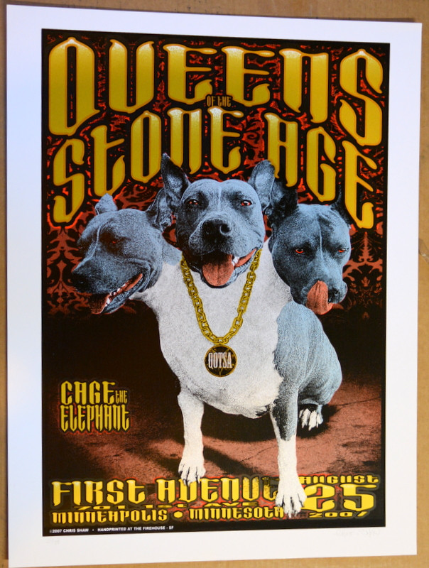 A BEAUTIFUL 2007 POSTER FOR QOTSA. THIS POSTER IS A LIMITED EDITION SILK SCREENED POSTER. DONE BY SAN FRANCISCO ARTIST CHRIS SHAW. THESE POSTERS ARE SIGNED AND NUMBERED, EDITION OF 100. IT IS IN MINT CONDITION. IT MEASURES ABOUT 19.00" X 25.00". THIS IS FOR THE AUGUST 25,2007 SHOW AT FIRST AVENUE IN MINNEAPOLIS. BEAUTIFUL PRINTING JOB. . USA PRIORITY MAIL. FIRST CLASS INTERNATIONAL.