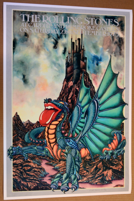 This is one of the most iconic and elusive Rolling Stones images in the world. Highly sought after, an original printing can go upwards of $4,000. Originally printed in 1973 for their shows at Cardiff And Pembroke Castles, Wales, September 22, 1973. The artwork is by Kate Burness. This is an authorized copy produced by the Artist Kate Burness. This elaborate and colorful poster is large format Giclee measuring 21" x 31". This is about the size of the original poster. This image is very rare. The Cardiff concert was cancelled over concerns that it would corrupt the Welsh youth and most of the posters were destroyed. This is signed and numbered by the artist. Truly worldwide edition of 73. It is in mint condition. Kate presently resides in New Zealand. Comes with Certificate of Authenticity also signed and numbered by the Artist Kate Burness. This was her first and only rock poster.