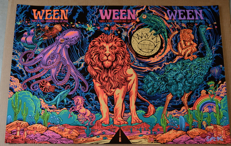 PRINTED ON METALLIC PAPER. THIS IS A TRIPTYCH, 3 UNCUT POSTERS. ARTIST PROOF EDITION OF 75, I HAVE VERY LOW NUMBERS. A FANTASTIC IMAGE FOR WEEN BY TODD SLATER. THIS IS FOR THE MARCH 16-17-18,2023 SHOWS AT THE BROOKLYN BOWL IN LAS VEGAS. IT IS MINT AND MEASURES AN EASY TO FRAME 24"X36". SIGNED, NUMBERED, AND A/Ped ARTIST EDITION OF 75. PRIORITY MAIL USA / FIRST CLASS INTERNATIONAL.